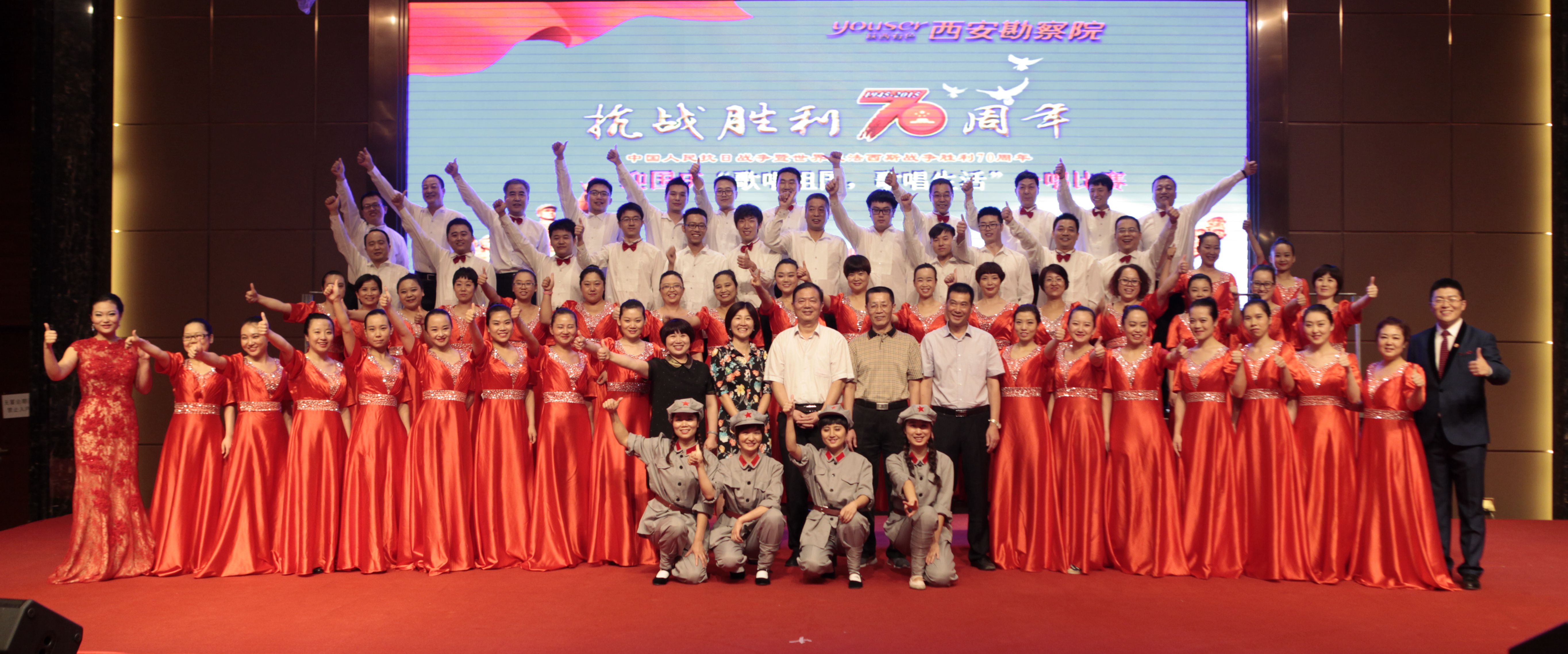 在曲江國(guó)際飯店的永寧大廳里,西勘院領(lǐng)導(dǎo)與500余名職工一同觀看了這次比賽。每個(gè)隊(duì)伍都準(zhǔn)備充足,拿出最佳水平,向祖國(guó)抗戰(zhàn)勝利七十周年獻(xiàn)禮。我公司選擇了《紅軍不怕遠(yuǎn)征難》和《走向復(fù)興》兩首歌曲,組織了有公司領(lǐng)導(dǎo)、職能部門負(fù)責(zé)人和員工60多人參加的合唱隊(duì),經(jīng)過一個(gè)多月的用心準(zhǔn)備,大家克服了工作和排練時(shí)間上的沖突,聽從排練老師的指揮,每一次都有進(jìn)步和收獲,最終贏得了比賽的勝利。