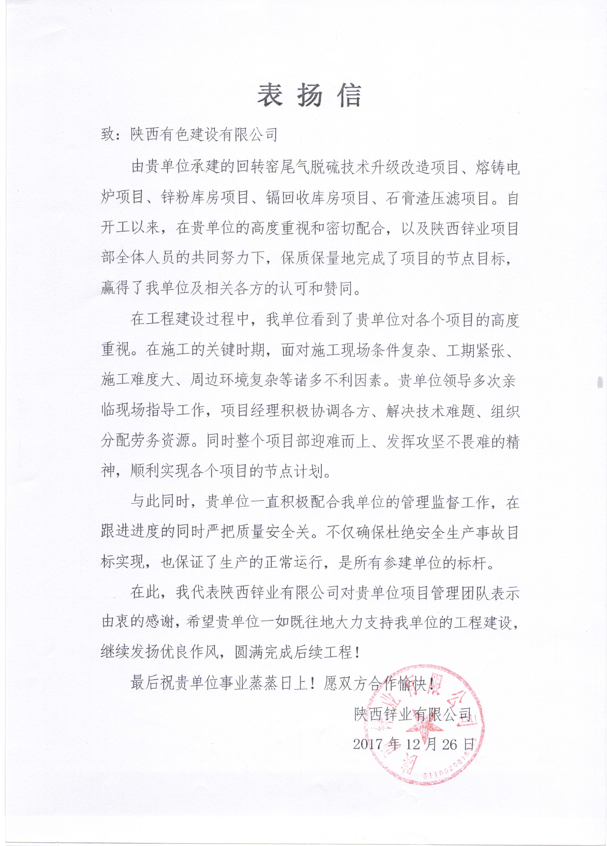 近日,公司收到陜西鋅業有限公司發來的表揚信,公司陜西鋅業項目部在回轉窯尾氣脫硫技術升級改造等5個項目建設過程中取得的成績表示感謝和高度贊揚。